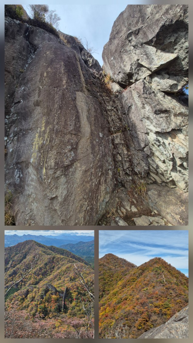 一番上の写真が獅子岩に登るハシゴでその先は少し鎖があり踏ん張って岩の上に登ります。