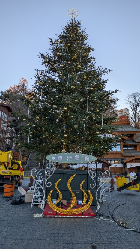 ・・・湯畑に到着すると・・・湯もみショ-近くにツリ-が設営工事中・・・