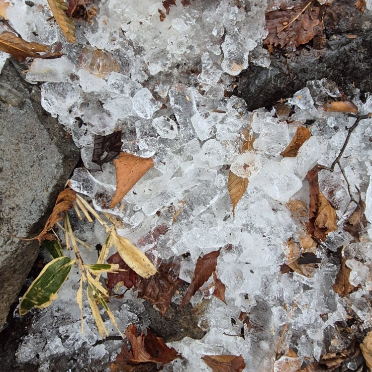 登っている途中で氷の粒らしきものがたくさん地面に落ちていました。まるでスーパーの冷凍食品を