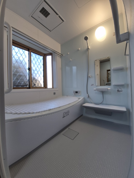 - 今回のリフォームでは、ユニットバスの入れ替えによって快適性・安全性・清掃性を総合的に向上させています。浴槽はゆったりとした形状で、保温性に優れたタイプを採用。お湯が冷めにくく、入浴時間を快適に過ごせます。床は滑りにくく、水はけの良い素材を使用し、濡れていても安心して動ける仕様としました。壁面は明るいブルー系のパネルで統一し、清潔感と開放感のある空間に。 【担当者コメント】 デザインと機能性のバランスを重視してご提案しました。壁パネルやカウンターまわりは汚れが付きにくく、日々のお掃除が負担にならない仕様です。これからも、安心して長く使えるリフォームをご提案してまいります。