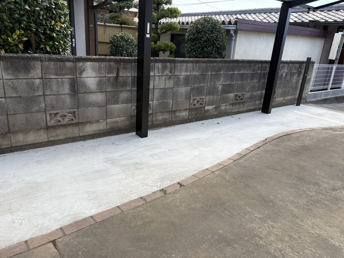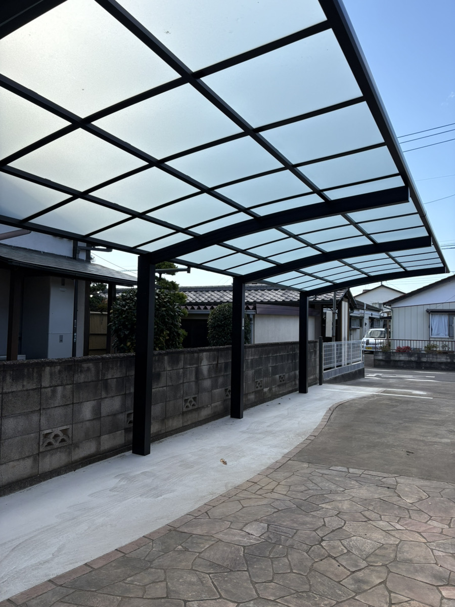 - 今回のリフォームでは、敷地形状に合わせてロングタイプのカーポートを新規設置し、快適性・利便性・外観の向上を図っています。広い屋根面積により、複数台分をしっかりカバーでき、雨の日でも濡れずに移動できる使い勝手の良い空間となっています。屋根材には明るさを保つポリカーボネートパネルを採用し、強度と採光性を両立。既存の外観にも自然に馴染むよう、ブラックのフレームですっきりとした印象に仕上げました。また、土間コンクリートも併せて打設し、日常の駐車や歩行がよりしやすいフラットな動線を実現しています。 【担当者コメント】 今回は、縦列駐車に対応できるカーポートを設置しました。大きめの屋根を採用したことで、お車をしっかりと保護できるだけでなく、日々の移動がとてもスムーズになったと感じていただけると思います。これからも、お客様の暮らしに寄り添った外構リフォームをご提案してまいります。